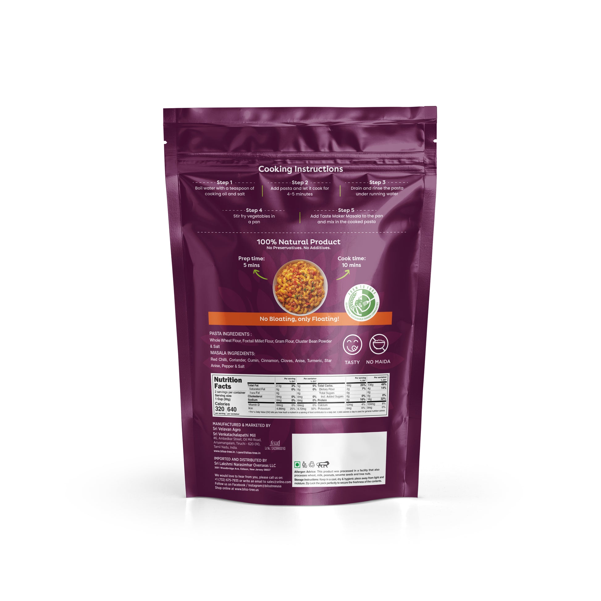 - Pasta Ingredients: Whole Wheat Flour, Foxtail Millet Flour, Gram Flour, Cluster Bean Powder, and Salt.
